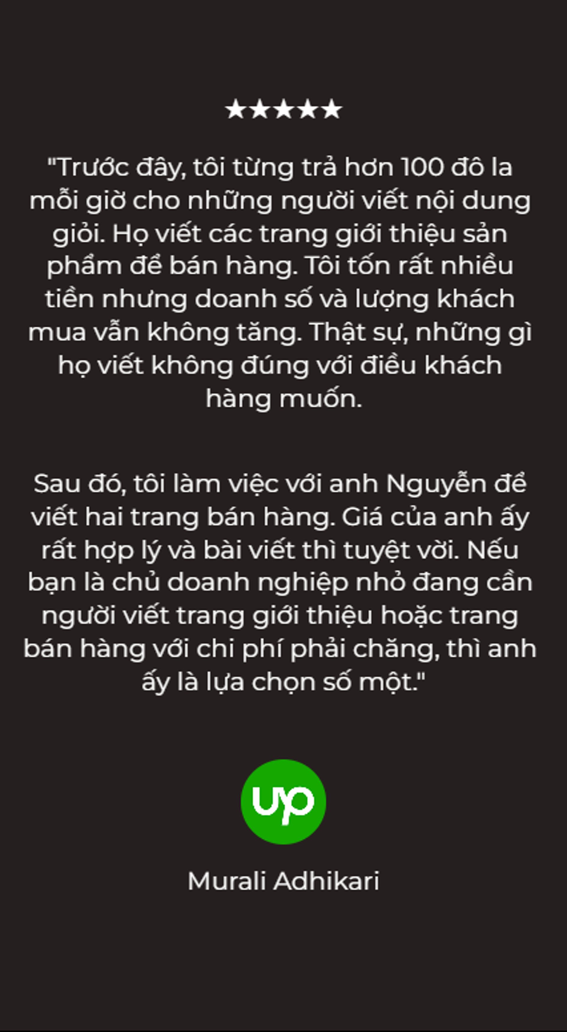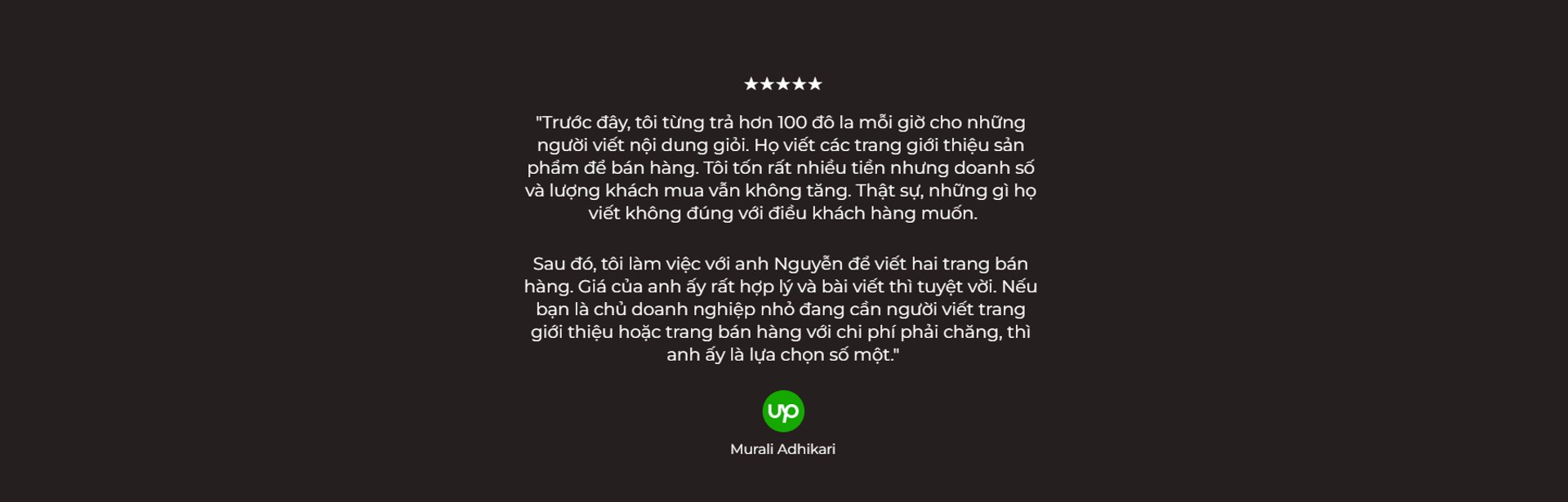 Sau đó, tôi làm việc với anh Nguyễn để viết hai trang bán hàng. Giá của anh ấy rất hợp lý và bài viết thì tuyệt vời. Nếu bạn là chủ doanh nghiệp nhỏ đang cần người viết trang giới thiệu hoặc trang bán hàng với chi phí phải chăng, thì anh ấy là lựa chọn số một."